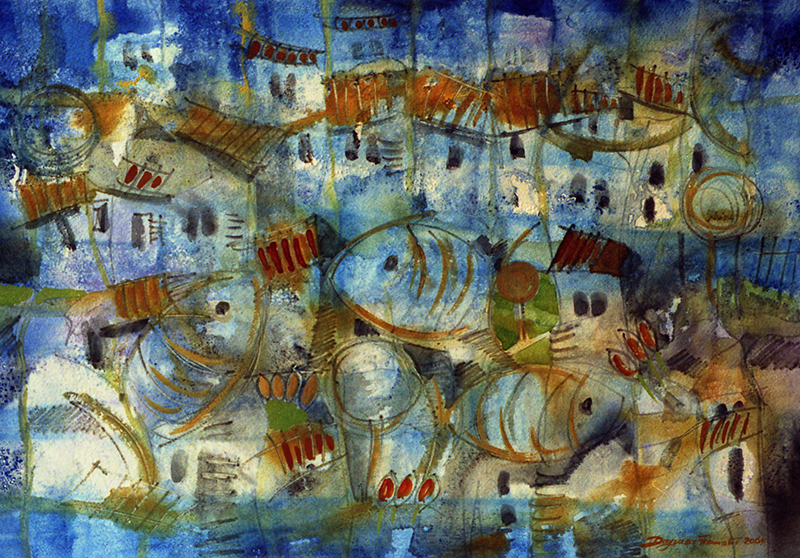 Kolorit izabrane palete čas poprima definirani oblik, a čas tajanstvenu plošnost otvarajući nam vrata drugačije prirode. Meditativan ritam izranja iz harmonije duhovnog i osjetilnog poimanja forme. Motivi, simboli ribe česti su, no sakriveni i nenametljivi.
