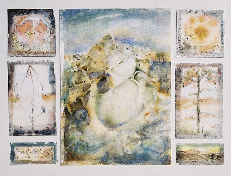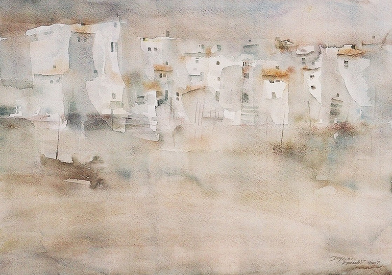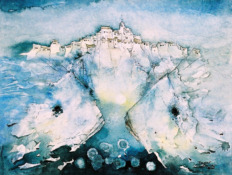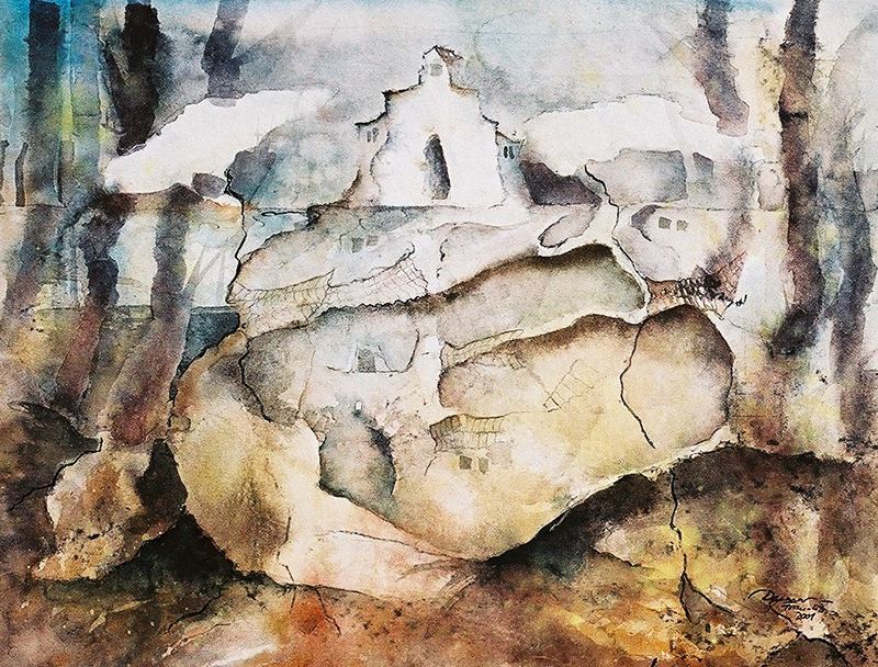 The depictions of citadels lit by sunlight, or of the foggy winter mornings, carry within themselves a scent of salt and wind from the sea that conquers and initiates us into the vastness and the islands landscapes. The flaring of the vedute, old churches, cisterns and stairs that lead to depths, is attained slowly and inconspicuously, but still with a recognizable spirit of the Mediterranean citadels. Woven by undertones that reach from lightest to darkest and mutually complement each other, the watercolor is affluent, while the composition is calming, at some places aided by drawing.