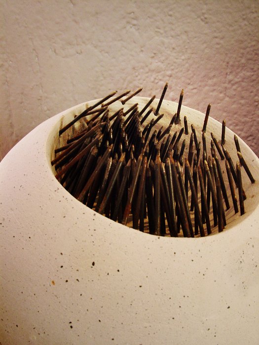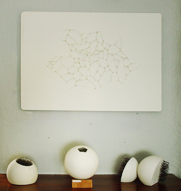 Ivan Blažetić displays to us his vision of a colorful future in harmony with nature trough scenes built into fold-out books. Marin Dlaka exposes his photographs trough which he delves into explorations of moving light and its reflections. Hana Dutina captures short intimate moments hidden from public in the eye of the camera. Lena Franolić exhibits lightweight objects composed trough a frolic of lines – inquiring into forms of growth and ligation. Igor Gržetić continues to research the problematic of fetishism trough a triptych of computer graphics (jet decides to show us a graphic made in the traditional technique also). Srđan Hulak displays a photograph of a lonely little man built of lego blocks. Nenad Jalšovec discloses a sculpture – a setup that irresistibly reminds of a cow barren of individuality – while he contemplates upon ownership and power over living organisms. Smiljana Polugić answers with the geometrical shape of the sphere to a demand for simplicity of form – confronting the soft plaster with firm and thorny nails. Maja Radešić shows us a graphic that symbolically comments communication between different generations. Vedrana Stipić plays with minimal impressions – enquiring into the harmony of relations that a play of different elements on a background of kraft paper brings forth. Damjan Šporčić uncovers broken old dish fragments out of the soil and forges New Dishes out of them connecting them with people that used to plough the land for a living. Vedrana Valenčić debates about the contemporary reality and her paradoxical truths. Barbara Zec documents ‘moments-in-between’ in which the space attracts attention, only to retract to its quotidian thereafter. Tonči Žužić notes contrasting elements of the old citadel and its new touristic functionality, while breathing life into a found piece of root trough minimal interventions.