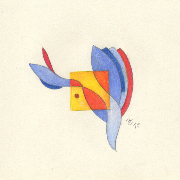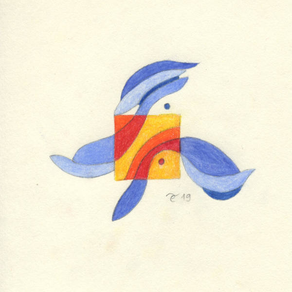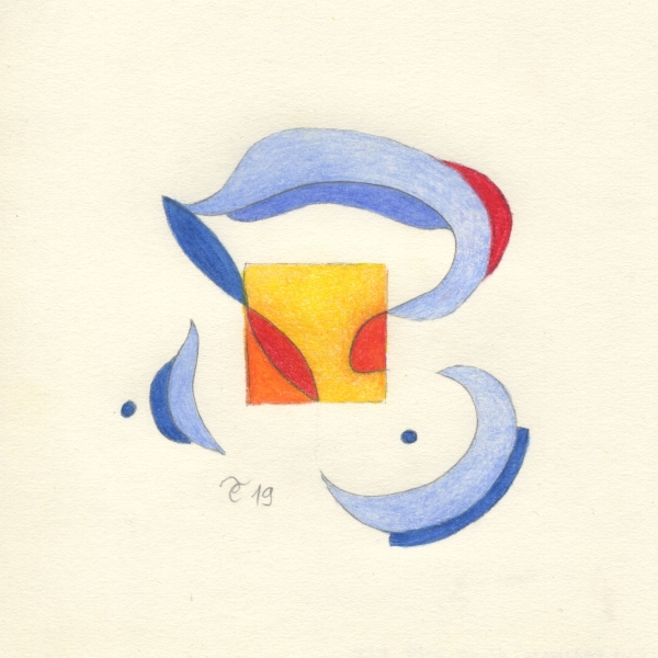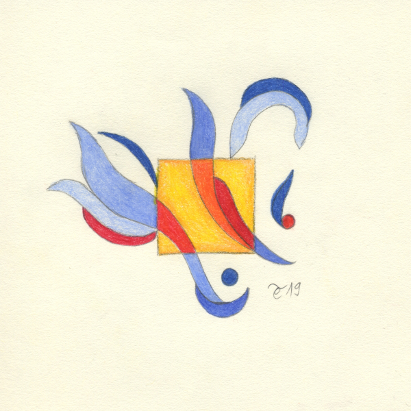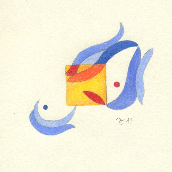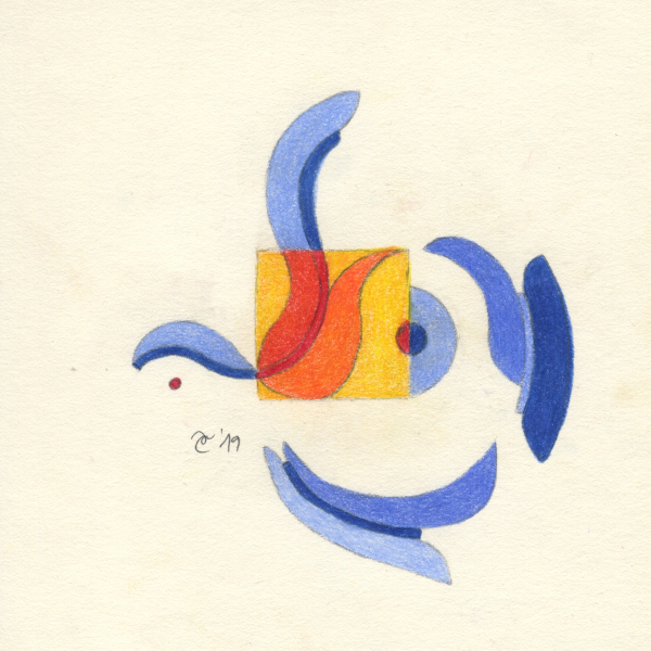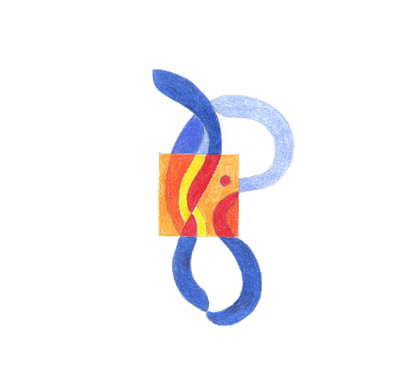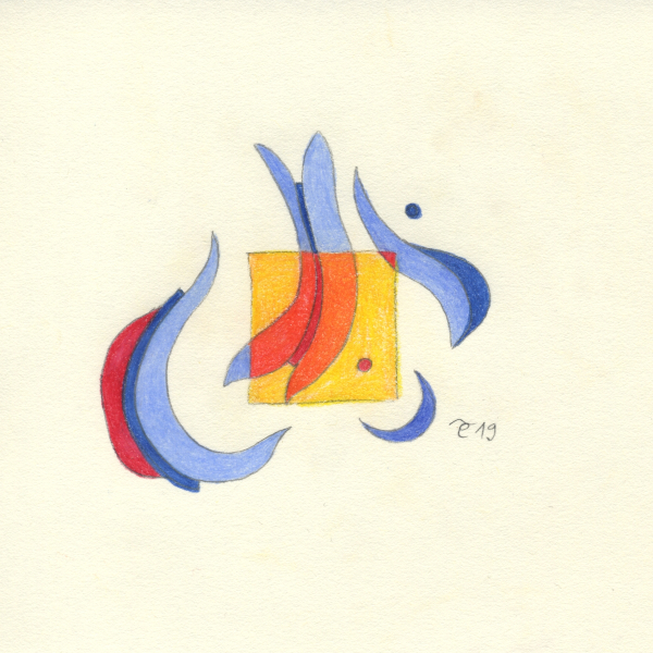 U težnji da nađem tečniji način izražavanja započela sam postavivši imaginarni okvir crtežu u vidu malog kvadrata što je intenzivirao moju usredotočenost dok sam boju ograničila na međuigru nijansi plave, crvene i žute2.