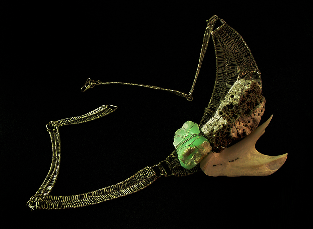 Ogrlica / Necklace / Halskette – Lena Franolić 2010 – oksidirana posrebrena bakrena žica, krizopras, kamen s plaže, riblja kost / oxydized siver plated copper wire, chrysoprase, stone from the beach, fishbone / oxidierter silberplattierter Kupferdraht, Chrysopras, Strand Stein, Fishknochen